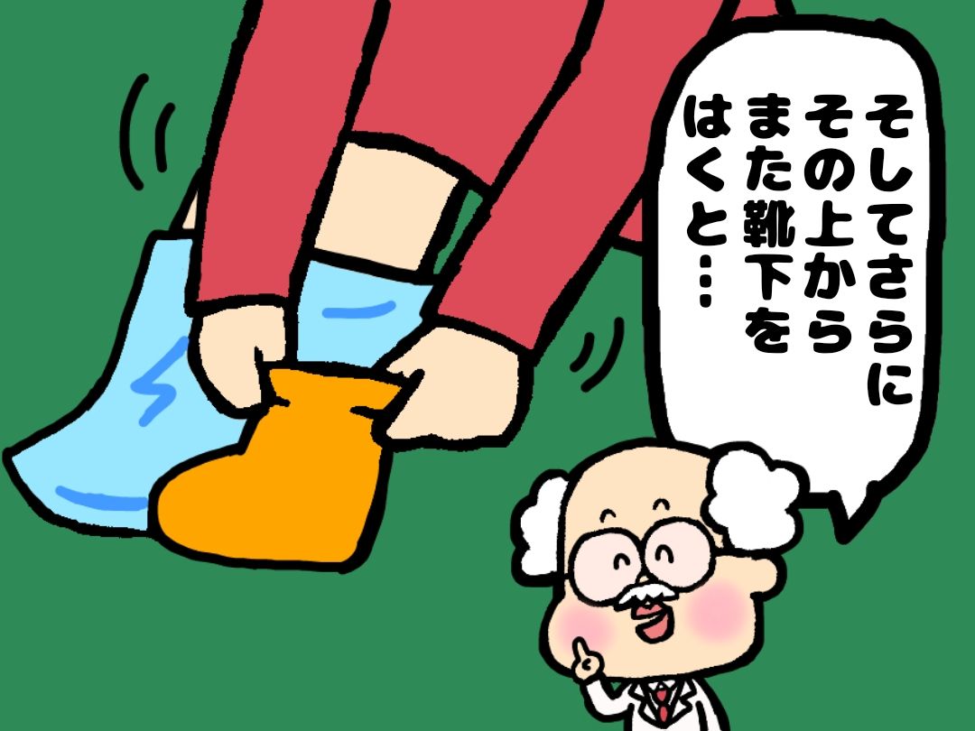 今シーズンは、普通の靴下、ぽかぽか系靴下、フェザー入りホームソックスの三重履きしてます!