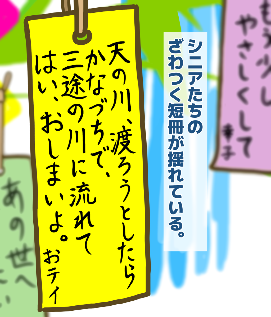 おテイさんの短冊も七夕らしい句かと思いきや、三途の川だとは…。。
