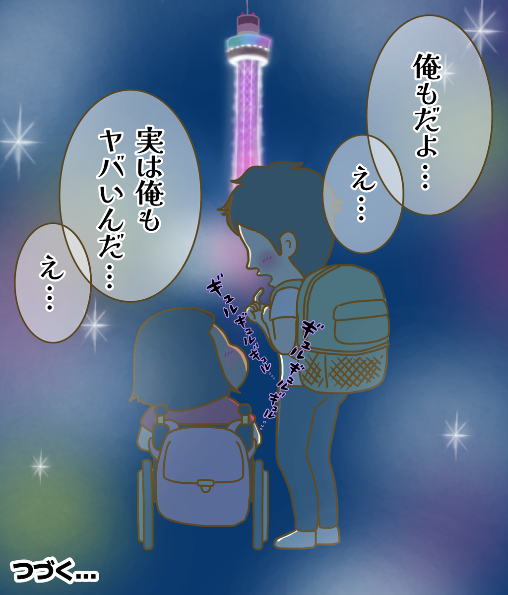 ラストのコマだけど、横浜ランドマークタワーをバックに幻想的な雰囲気でのツーショットが素敵(描き込み量のエグさにもご注目!)